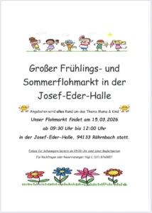 Großer Frühlings-& Sommerflohmarkt Angeboten wird alles Rund um das Thema MAMA & KIND von 9:00 Uhr bis 12:30 Uhr Josef-Eder-Halle, Röhrnbach